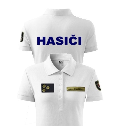 Hasiči – biela dámska polokošeľa s modrým nápisom HASIČI (v zadu), rukávovým znakom DPO a príprava na aplikácie hodnosť a menovka (suché zipsy).